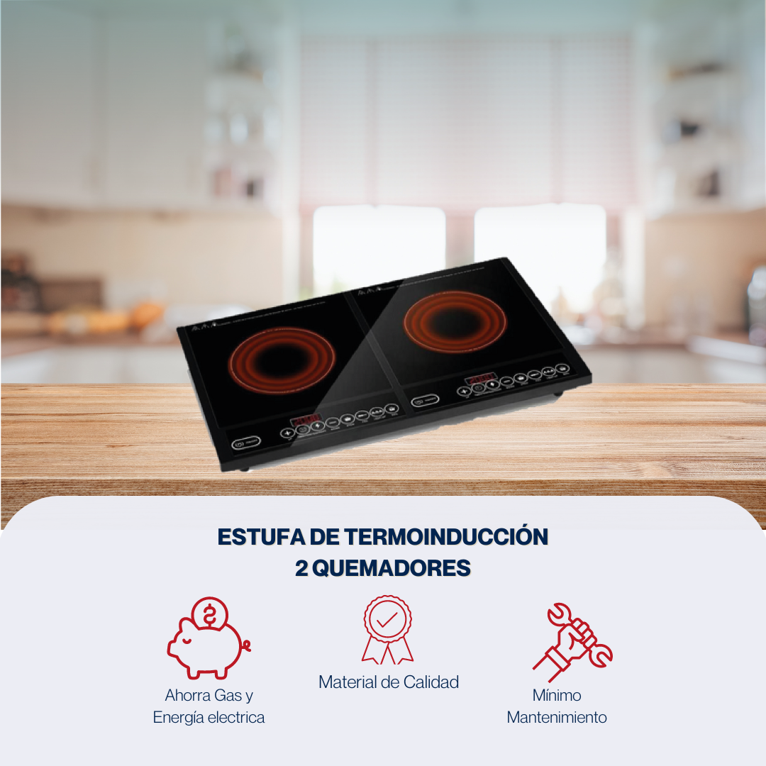 Estufa de termoinducción, 2 quemadores, Marca Ecocina, Ahorra gas y electricicdad.